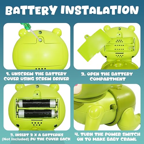 🔋⚡BATTERY OPERATED :- Take out the battery compartment cover, put 2 x AAA batteries (not included), screw up the cover back, turn the power button ON and enjoy the fun of this cute little crawling baby toy for kids. Always use new and same variety of batteries, do not mix and match different or old batteries with new ones.