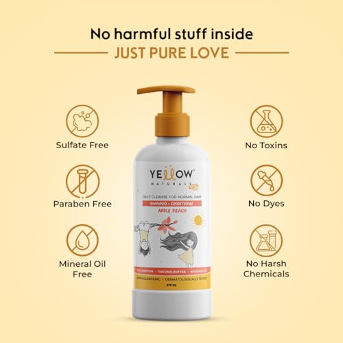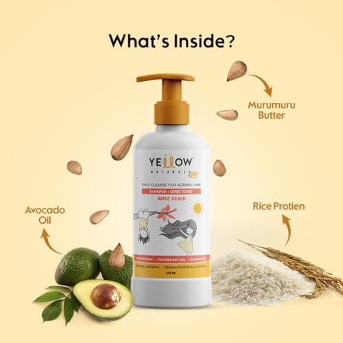 Yellow Naturals Kids Shampoo | 275 ml | Shampoo & Conditioner for 4-12yrs, Baby Shampoo, PH Balanced, Rice Protein & Tucuma Butter, Sulphate & Paraben Free, Daily Cleanse for Normal Hair (Apple Peach)