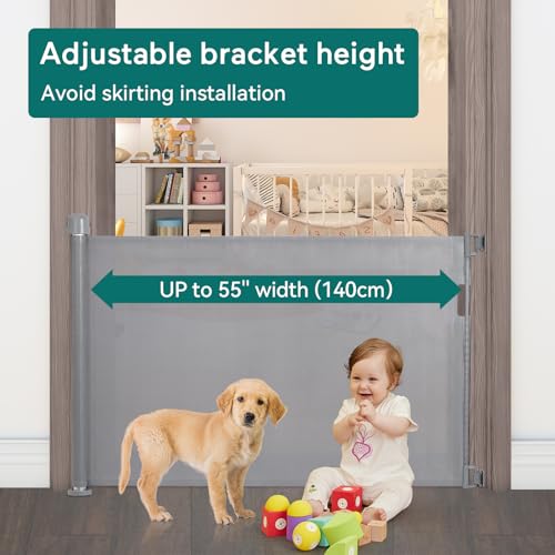 YOOFOR Retractable Baby Gate, Extra Wide Safety Kids or Pets Gate, 33” Tall, Extends to 55” Wide, Mesh Safety Dog Gate for Stairs, Indoor, Outdoor, Doorways, Hallways (Grey, 33″x55″)