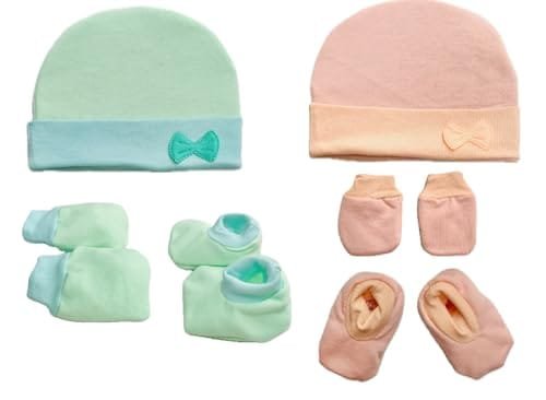 LuvLap 100% Cotton Baby Caps, Mittens and Booties Combo Set for 0-6 Months – Pack of 2 (Assorted)