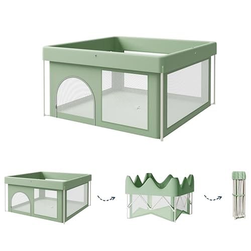 Kids Station Portable and Foldable Baby Playard Playpen – Thick Padding & 360° Mesh Visibility – Play Gate Fence for Toddlers – Storage Pocket and Safety Lock & Hand Grip – Suitable for Babies – 5ftx5ft or 150x150cm (Green)